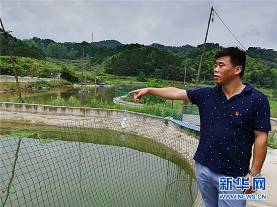 鄭發達在魚塘邊介紹養魚經驗。新華網李東標 攝