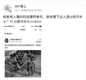 近日,有網友在微博爆料稱,摩拜等共享單車的出售信息出現在一些二手車平臺上,一輛摩拜的價格在2000元左右。在某二手交易平臺上,還有人出價2000元回收摩拜單車。記者在網友發的截圖上看到,“2000元高價回收摩拜自行車”,條件是“需拆除GPS”。