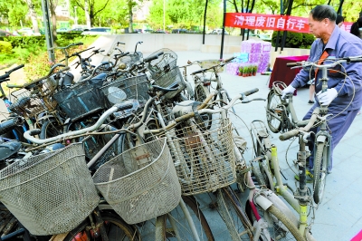 “吉慶里的冬青叢邊就停著幾輛自行車,不知道多少年沒人碰過了。”朝外街道相關負責人說,在老舊小區,不論是墻根下,還是車棚里,都能找到“僵尸自行車”的身影。它們有的落滿塵埃、銹跡斑斑,有的輪胎發癟開裂,甚至“缺胳膊少腿”,擠占了大量公共空間。為了清僵尸車給共享單車騰地兒,一個月前,吉慶里社區在每輛自行車的把手上系了一根紅繩,如果紅繩被摘除,就說明車子有主人,反之,則由社區、街道統一回收、清走。此外,居民自家的閑置自行車也能送到社區,兌換盆栽、綠植。