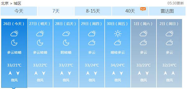 未來一周大部分時間北京都會以晴到多云天氣為主,天氣炎熱,最高溫可達33-34℃,最低溫在21-24℃之間,但今天至28日午后到傍晚西部、北部多分散性雷陣雨天氣,提醒大家注意防范。