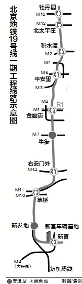 地鐵19號線分兩期建設,一期由豐臺新宮至海淀牡丹園,全長約22.4公里。全線設10座車站,其中8座為換乘站,分別為新宮(大興線)、新發地、草橋(新機場線、M10、M11)、右安門外(M14)、牛街、金融街(M1、M2、R1)、平安里(M6、M3、M4)、積水潭(M2)、北太平莊(M12)、牡丹園(M10)。