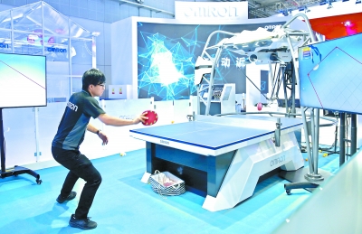 11月4日,工作人員在歐姆龍自動化(中國)有限公司展臺測試打乒乓球的機器人。新華社記者 張玉薇 攝