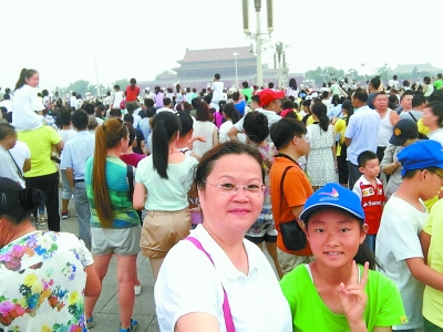 陳大姐和張海榮(右)在天安門廣場合影。賈換軍攝