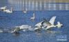 這是北京市密云區太師屯鎮蘆各莊村清水河水面上的野生白天鵝(3月13日攝)。 記者3月22日從北京市密云區委宣傳部獲悉,得益于密云水庫周邊生態環境改善,闊別12年之后,密云區太師屯鎮蘆各莊村清水河再次迎來大量野生白天鵝棲息。(新華社齊如久 攝)