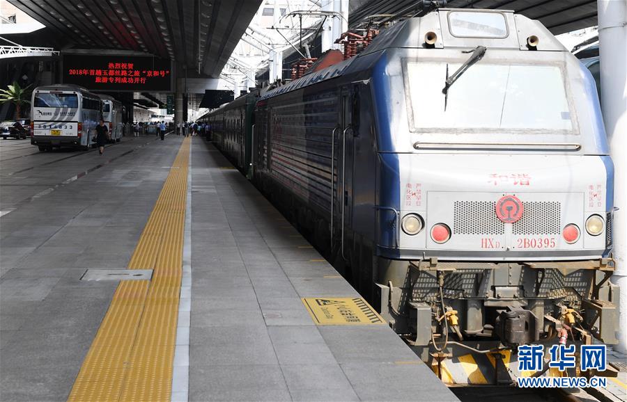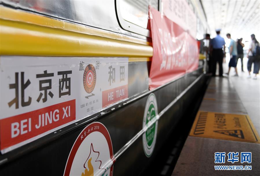 6月24日,“京和號(hào)”旅游專(zhuān)列停靠站臺(tái)準(zhǔn)備出發(fā)。 當(dāng)日,2018年首趟“京和號(hào)”旅游專(zhuān)列在北京開(kāi)行。來(lái)自京津冀區(qū)域的400多名游客乘坐此趟專(zhuān)列從北京西站出發(fā),開(kāi)啟為期16天涵蓋和田、喀什、庫(kù)爾勒、吐魯番、哈密、張掖、敦煌等地的旅程。新華社記者 張晨霖 攝 -