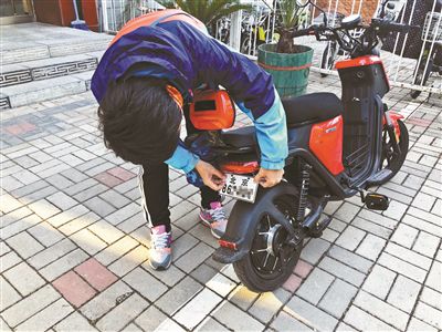 一位市民為自己的電動自行車換上剛辦好的號牌攝影/孔令晗
