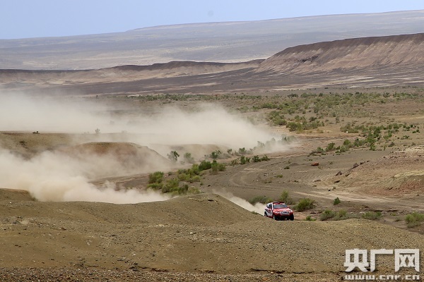 央廣網烏魯木齊6月29日消息(記者王延輝)昨天(28日)傍晚2015環塔拉力賽結束第六賽段的比賽。第六賽段以戈壁、河床沙漠牧道為主,賽段全長430km。原本大家以為難度相對不大的賽段,卻因為一場意外的大雨變得異常艱難,車手們經歷了一次考驗而哈弗車隊駕駛104號賽車的韓魏與潘宏宇在艱苦的路段上繼續穩定的發揮,以4小時35分12秒獲得SS6賽段冠軍,繼續擴大領先優勢。