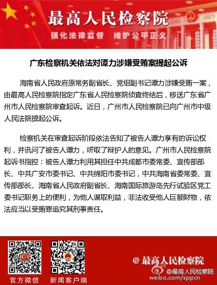 央廣網北京11月24日消息(記者孫瑩)廣東檢察機關依法對譚力涉嫌受賄案提起公訴。