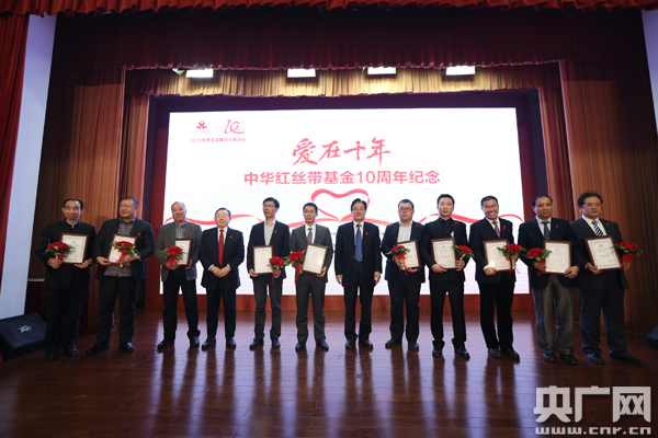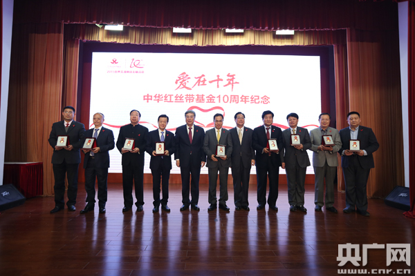 2015年11月30日,在第28個(gè)世界艾滋病日來臨前夕,中華紅絲帶基金“愛在十年”十周年紀(jì)念活動(dòng)在京舉行,向全社會(huì)發(fā)布紅絲帶10年來防艾工作成果,并向?yàn)榉腊ぷ髯龀鲐暙I(xiàn)的愛心人士、基層工作機(jī)構(gòu)頒發(fā)“紅絲帶十年獎(jiǎng)”,并向?yàn)榘滩》揽刈龀鐾怀鲐暙I(xiàn)的愛心企業(yè)家、社會(huì)力量、公眾人士、感染者代表頒發(fā)第四屆“感動(dòng)紅絲帶獎(jiǎng)”。全國工商聯(lián)名譽(yù)主席、中華紅絲帶基金名譽(yù)理事長黃孟復(fù),國家衛(wèi)計(jì)委副主任、國家中醫(yī)藥管理局局長、國務(wù)院防治艾滋病工作委員會(huì)辦公室主任王國強(qiáng),世界衛(wèi)生組織駐華代表施賀德,全國工商聯(lián)副主席、中華紅絲帶基金理事長謝經(jīng)榮,中國人民對外友好協(xié)會(huì)副會(huì)長謝元,全國政協(xié)經(jīng)濟(jì)委員會(huì)副主任、世茂集團(tuán)董事局主席、基金執(zhí)行理事長許榮茂,全國工商聯(lián)副主席、漢能控股集團(tuán)董事局主席、基金副理事長李河君,原衛(wèi)生部副部長、基金副理事長彭玉,全國工商聯(lián)原常務(wù)副主席孫安民,全國工商聯(lián)原副主席張龍之,全國工商聯(lián)原副主席、基金監(jiān)事長瞿懷明,全國工商聯(lián)原副主席張?jiān),國?wù)院參事、中國光彩事業(yè)基金會(huì)理事長謝伯陽以及基金形象大使白巖松,預(yù)防艾滋病宣傳員、中央電視臺主持人周濤,基金涼山項(xiàng)目關(guān)愛大使、中央電視臺主持人沙瑪阿果,表演藝術(shù)家侯耀華等領(lǐng)導(dǎo)和嘉賓出席此次活動(dòng)。