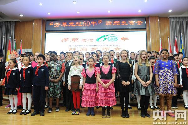 芳草地國際學(xué)生的中外小朋友一起唱校歌