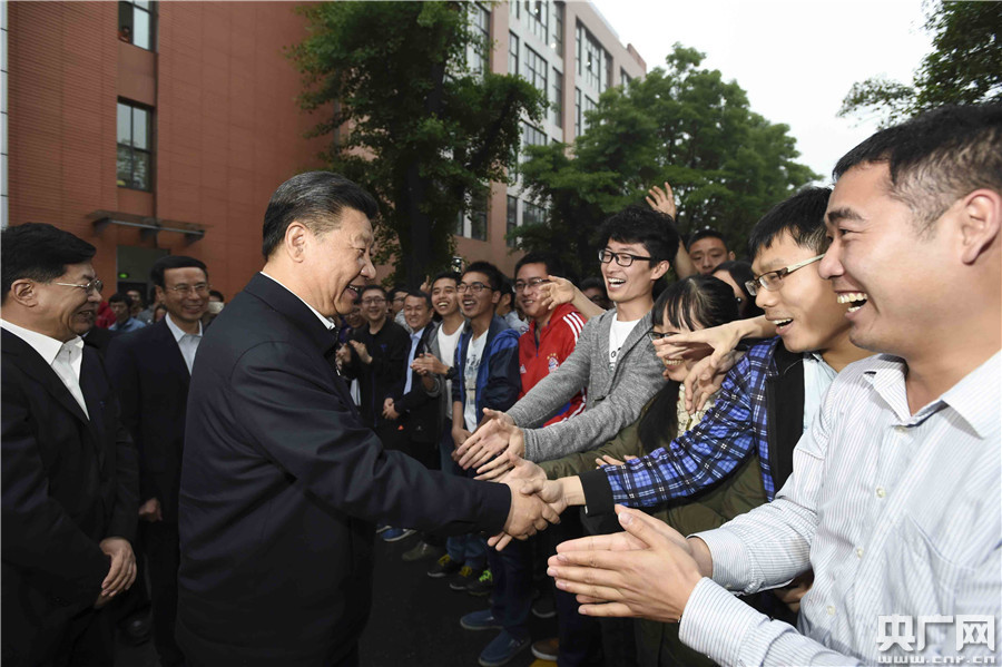 4月26日下午,習近平總書記來到中國科技大學圖書館自習室,同學生愉快交談。(新華社記者李濤 李學仁/攝) 央廣網合肥4月26日消息(記者劉樂)4月26日下午,習近平總書記來到中國科技大學圖書館自習室。見到總書記來了,學生們圍攏過來,爭著向總書記問好。“家是哪里的?一個人來合肥上大學爸媽放心嗎?”“國防班有多少人?招生時就定向了吧?”“去西部地區支教這一年感受很深吧?農村的孩子,不忘初衷。”“在圖書館學習覺得氛圍很好吧?還得早點來占個座?”總書記同身邊的學生愉快交談著。大家你一言我一語回答總書記提出的問題,談自己的大學生活,講人生的目標理想。 聽了同學們的話,總書記說,過去中國人口多、人手多,現在正轉變成人才多。建設制造業強國、實現“兩個一百年”奮斗目標,教育是基礎。我們對中國建設國際一流大學、培養國際一流人才充滿自信。我們的胸襟是開放的,包容并蓄。幸福不是從天降,中國人民取得的成就是很了不起的,不要妄自菲薄,同時要自強不息。年青人在學校要心無旁騖,學成文武藝,報效祖國和人民,報效中華民族。同學們好好學吧! -