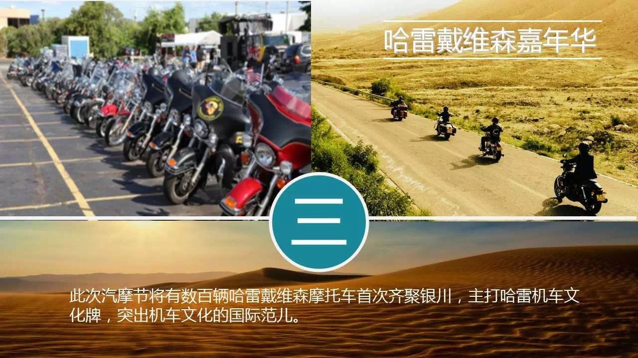 本次汽摩節(jié)包含八大系列活動。一是獨具西部風情的發(fā)車儀式,二是盛大的機車大巡游,三是激情四射的水上運動表演,四是狂野熱烈的賀蘭山傳奇搖滾音樂盛會,五是哈雷戴維森嘉年華等系列活動,六是“絲路旅行”攝影大賽,七是開展哈雷巡游賀蘭山百萬畝葡萄酒長廊活動,八是體驗激情與速度的賀蘭山摩托車場地賽。這一系列的活動將讓廣大的車迷、樂迷感受碧水藍天,明媚銀川的塞上美景的同時,也將點燃每一位參與者的夏日激情。