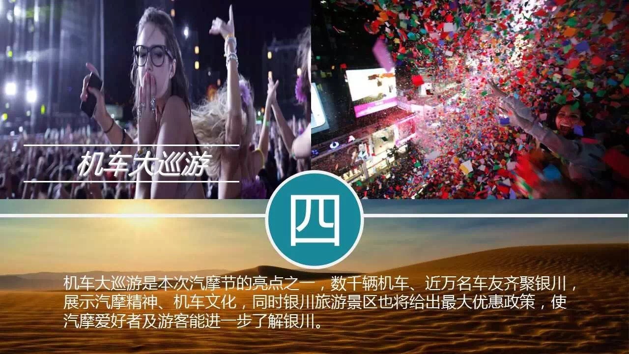四大點亮包括“穿越絲路 從銀川啟航”為主題的汽車摩托車穿越活動,將會穿越美國、迪拜等國際化現(xiàn)代大都市;亮點二是濱河之夜全國體育娛樂明星愛心足球賽,本次明星賽是此次汽摩節(jié)的開幕環(huán)節(jié),已邀請到由孫楠領銜的國內(nèi)體育界、演藝界明星組成的明星足球隊來銀進行慈善表演比賽;亮點三是哈雷戴維森嘉年華將在銀川盛大舉行,屆時將有數(shù)百輛哈雷戴維森摩托車首次齊聚塞上,并舉行絲路銀川穿越之旅,在閱海舉行狂歡節(jié),點燃盛夏激情,同時還有路虎、美國吉普、房車以及專業(yè)賽車等前來助陣;亮點四是銀川十大景區(qū)為本次汽摩節(jié)傾情助陣,提供優(yōu)惠政策,前來參加汽摩節(jié)的車手可免費參觀各大景點。
