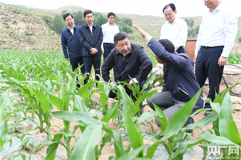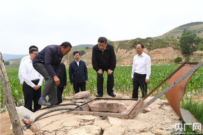 習(xí)近平走進(jìn)趙家洼村的一片農(nóng)田,察看玉米和蕓豆長(zhǎng)勢(shì)。村支書告訴總書記,因?yàn)楦珊担f稼植株矮小,產(chǎn)量很低,村民們靠天吃飯。總書記向村民了解了地膜的保墑作用。總書記來到村里唯一的一口飲水井旁,登上用石塊壘起的井臺(tái),仔細(xì)察看井里蓄水的情況。