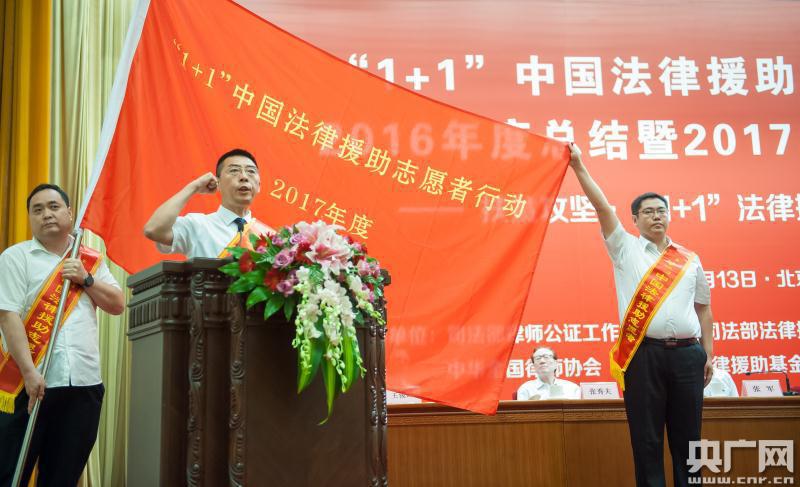 央廣網北京7月13日消息(記者孫瑩)據中國之聲《央廣新聞》報道,2017年度“1+1”中國法律援助志愿者行動啟動儀式在北京人民大會堂舉行,242名律師和大學生志愿者從司法部部長、黨組書記張軍手中接過了“1+1”中國法律援助志愿者行動旗幟,并莊嚴宣誓,他們將奔赴青海、西藏、新疆、貴州等14個省(區、市)和新疆生產建設兵團的170多個縣(區),開展為期一年的法律援助志愿服務,扶貧攻堅。