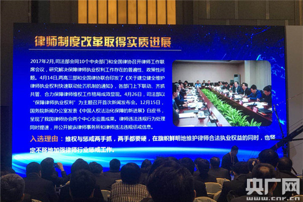 2017年2月,司法部會(huì)同10個(gè)中央部門(mén)和全國(guó)律協(xié)召開(kāi)律師工作聯(lián)席會(huì)議,研究解決保障律師執(zhí)業(yè)權(quán)利工作存在的普遍性、政策性問(wèn)題。4月14日,兩高三部和全國(guó)律協(xié)聯(lián)合印發(fā)了《關(guān)于建立健全維護(hù)律師執(zhí)業(yè)權(quán)利快速聯(lián)動(dòng)處置機(jī)制的通知》,各部門(mén)上下聯(lián)動(dòng)、齊抓共管、合力保障律師維權(quán)工作格局成效顯現(xiàn)。4月26日,司法部以“保障律師執(zhí)業(yè)權(quán)利”為主題召開(kāi)首次新聞發(fā)布會(huì)。12月15日,國(guó)務(wù)院新聞辦公室發(fā)表《中國(guó)人權(quán)法治化保障的新進(jìn)展》白皮書(shū),呈現(xiàn)了我國(guó)律師協(xié)會(huì)兩個(gè)中心全覆蓋成果。律師違法違規(guī)行為處理同時(shí)提速,并公開(kāi)披露律師事務(wù)所和律師違法違規(guī)懲戒信息。