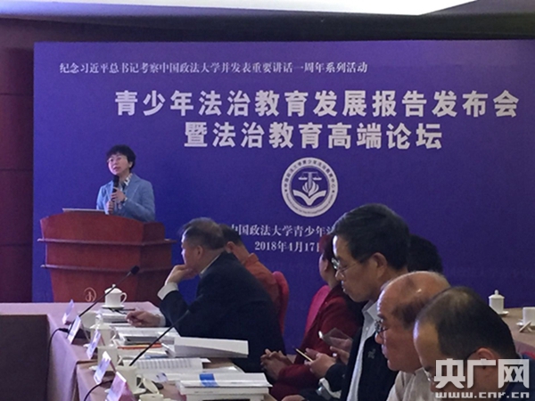 央廣網(wǎng)北京4月17日消息(記者孫瑩)中國(guó)政法大學(xué)青少年法治教育中心今天在京發(fā)布了《我國(guó)青少年法治教育發(fā)展報(bào)告(2018)》,報(bào)告數(shù)據(jù)顯示,近年來我國(guó)的青少年法治素養(yǎng)和中小學(xué)的法治教育工作取得了長(zhǎng)足進(jìn)步,仍有若干不足。中國(guó)政法大學(xué)校長(zhǎng)黃進(jìn)、司法部法治宣傳司副司長(zhǎng)劉漢銀在致辭中均表示,此報(bào)告對(duì)于全面了解、客觀評(píng)估我國(guó)青少年法治教育現(xiàn)狀,未來有針對(duì)性地對(duì)我國(guó)青少年進(jìn)行法治教育,提高公民法治素養(yǎng)非常有借鑒價(jià)值。
