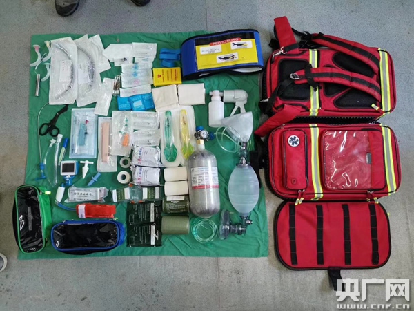 李銳的急救包,內含氧氣鋼瓶、面罩、藥品、注射器、繃帶等(央廣網發 受訪者供圖)