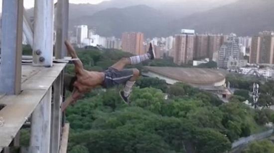近日,委內(nèi)瑞拉首都加拉加斯上演了驚險(xiǎn)刺激的一幕。26歲的極限運(yùn)動(dòng)員加布里埃爾阿拉伊在60層樓高的建筑上,懸空進(jìn)行單手引體向上等高難度動(dòng)作,沒(méi)有穿戴任何安全防護(hù)設(shè)備。高空運(yùn)動(dòng)的視頻被上傳到網(wǎng)上,著實(shí)讓觀眾為他捏一把汗。