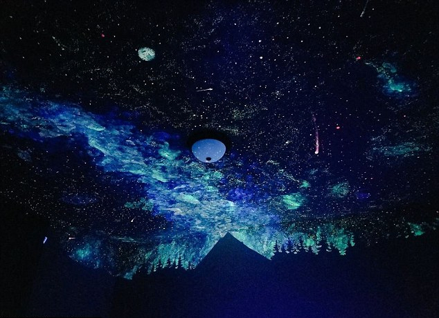 克里斯平說:“繪制墻面的油漆在白天看不見,只能在黑暗中發光,所以我只能在微暗的房間里,踩在結實的梯子上伴著音樂繪畫。”她還做了針葉林模板,用藍色膠帶貼在天花板下方。當燈光熄滅的時候,一抬頭就能看見璀璨的星空。
