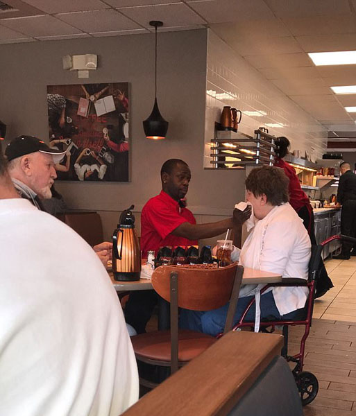 照片中,托馬斯一邊幫助行動不便的殘疾顧客進食,一邊輕輕地用餐巾幫她擦拭嘴角,十分細致耐心。這張照片是由餐廳內另一位顧客克希婭?多特森拍攝的,克希婭將這治愈人心的一幕發送給了托馬斯所在連鎖餐廳的“臉譜”官方帳號,引起了網友和媒體的廣泛關注。