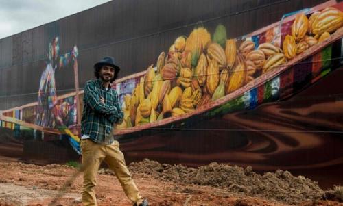 此次的壁畫(huà),科布拉以巧克力的原材料可可為題材。畫(huà)中,一名男子在“巧克力河”上劃著小船,船上滿載著可可果實(shí)。