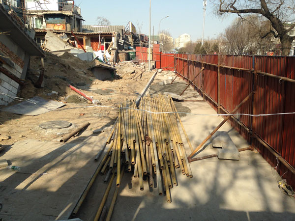 今天下午,記者來到北京德勝門內大街93號,這里搶修施工暫停,附近只有幾個城管和市政的工作人員看守,F場被藍色的圍擋圈住,透過圍擋,可以看到93號院內,曾經的18米深坑已經被混凝土填埋完畢,剩余的建筑物歪七倒八。隔壁牛大爺說: