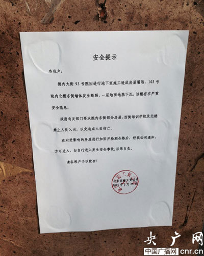 牛大爺所說發生坍塌,是93號隔壁的103號院,這個白色四層建筑屬于北京中天華鼎建筑設計有限責任公司。公司門口張貼的告示寫著因德內大街93號院進行地下室施工造成房屋坍塌,103號院內北樓東側墻體發生斷裂,一層地面地基下沉,該樓存在嚴重隱患。該公司大門緊閉。