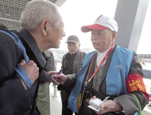 志愿者老徐在為旅客指路。記者王鵬攝