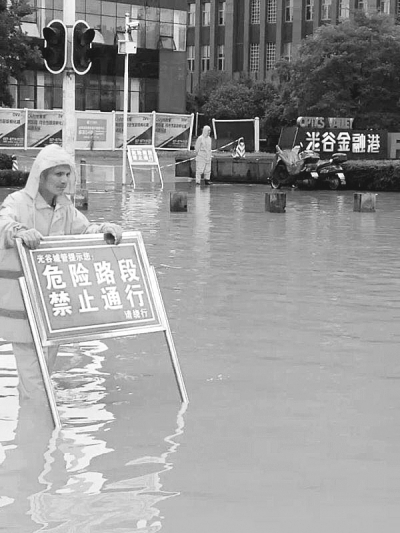 提醒大家繞行 “舉牌哥”在齊膝深的水中守了4天