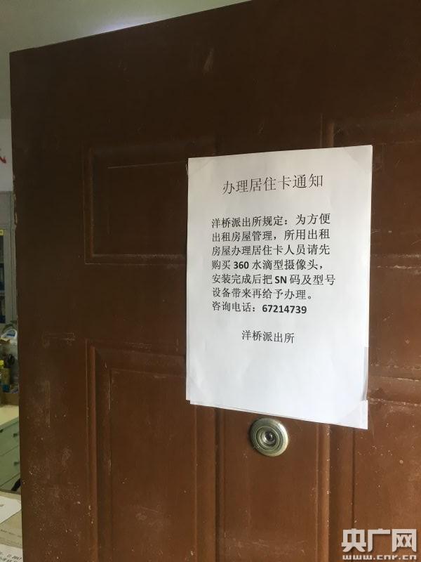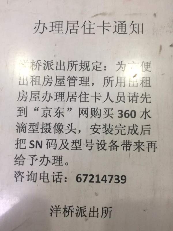 薛女士提供的現場照片上,可以看到一份名為“辦理居住卡通知”。其中這樣表述:洋橋派出所規定,為方便出租房屋管理,所用(有)出租房屋辦理居住卡人員請先到京東網購360水滴型攝像頭,安裝完成后,把SN碼及型號設備帶來,再給予辦理。后面所附的咨詢電話,正是洋橋派出所的辦公電話。