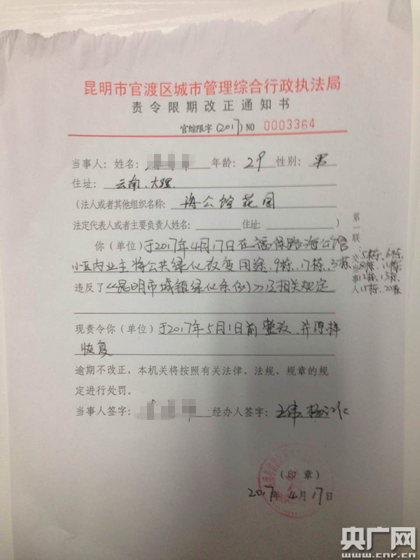 而一樓業主的說法,也被開發商云南招商城投公司所認可。一位樓盤售后經理證實,“當時買房的時候,一樓的業主是可以使用這個花園的,其他業主都簽過字的,這不叫侵占。只是說對花園的使用以及圍合的面積,還有一些樣式有一些規定,不能夠改變他原來圍合的形式。現在有個別業主,圍合的部分超出了原來規定的高度,還有些局部硬化了,我們要求他整改。”