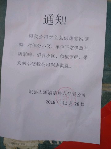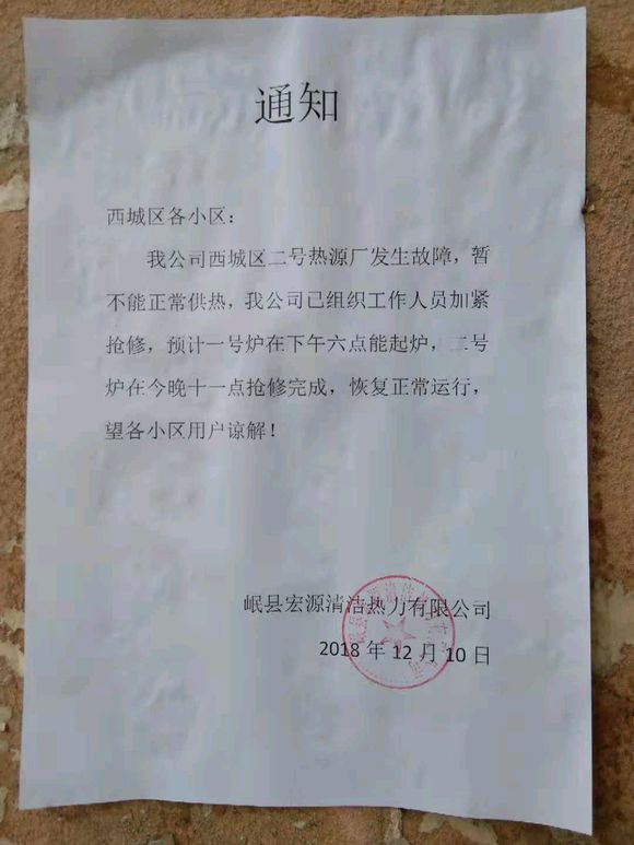 根據網友提供的圖片,在2018年11月28日、12月10日,宏源清潔熱力公司以管網調整、熱源廠發生故障等原因暫停了供暖。