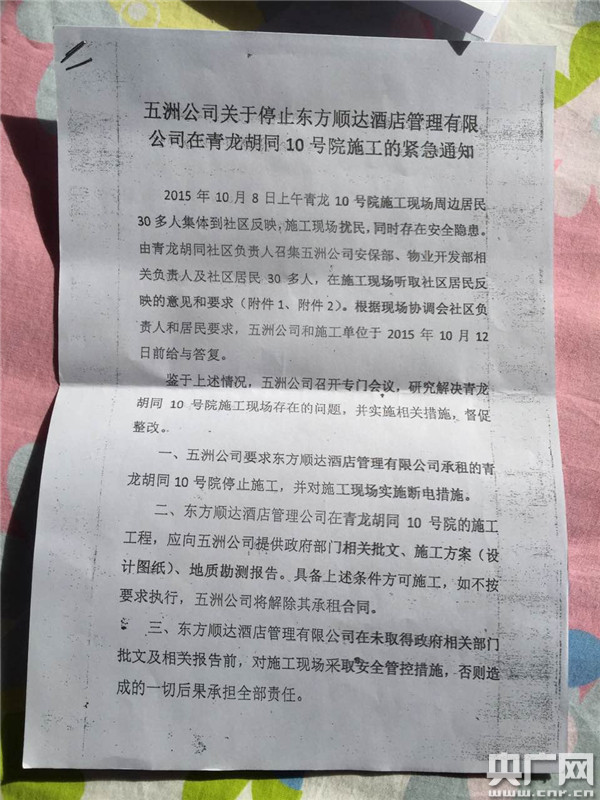 有居民給記者提供了一份蓋有公章的《五洲公司關于停止東方順達酒店集團有限公司在青龍胡同10號院施工的緊急通知》,從內容上可以推測,該院的業主單位是北京光華五洲公司紡織集團公司。其官方信息顯示,該公司上級公司是北京市的一家國企北京光華紡織集團有限公司。而10號院的承租方則是東方順達酒店管理公司,該公司在網上的公開資料并不多。附近的居民說,挖地下室是為了建旅館,而施工單位對外稱則要蓋古建,但該說法尚未得到官方確認。