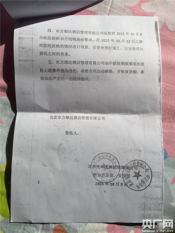 這份通知顯示,早在10月9號,五洲公司就要求“東方順達酒店集團有限公司承租的青龍胡同10號院停止施工,并對施工現場實施斷電措施”,要求采取安全管控措施,否則承租合同自動解除。但這份通知的結尾簽收人東方順達酒店集團并未蓋章簽字。