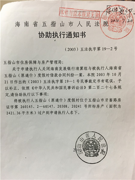 競拍時,王鳳和查看核實了關(guān)閉海發(fā)行清算組對拍賣的兩處房產(chǎn)有沒有完全所有權(quán)。2003年,五指山人民法院將五指山度假村中的兩處房產(chǎn),裁定給關(guān)閉海發(fā)行清算組。王鳳和放心地買下這兩處房產(chǎn)后,在今年2月份,從五指山房管局順利拿到房產(chǎn)證。拿證、收房,這是常見買房步驟。但問題出在收房環(huán)節(jié):“一個是洗衣房,一個是大會議室,我們把寫的騰房公告貼墻上,限他多少天之內(nèi)給我們騰房,我們貼完公告后找到相關(guān)占房公司,他們說他們也有產(chǎn)權(quán)證,房子是他們的!