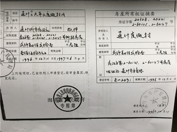 1996年12月11號,由五指山房管局頒發(fā)的他項權(quán)利證,其中“房證字第20308、20241號”,正是237.9平米的大會議室與322平米的洗衣房。