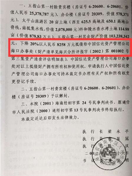 同一處房產(chǎn)出現(xiàn)兩本房產(chǎn)證,這讓王鳳和覺得不可思議。后來,在與五指山市房管局交涉中,王鳳和了解到,五指山金手指房本,也是2007年拍賣得來,并且經(jīng)過海南省一中院2002年作出的生效裁定書認(rèn)定:“海南中院有個裁定書,上面裁給信達(dá)公司,信達(dá)公司委托拍賣給海南金手指。”