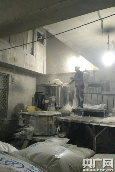 車間二樓,落滿了白色粉塵,作業(yè)人員并沒(méi)有佩戴口罩等防護(hù)措施,記者一走進(jìn)去就嗆得感覺整個(gè)肺都不舒服。環(huán)保部華北督查中心二處副處長(zhǎng)劉傳義一下指出了上料口長(zhǎng)期無(wú)組織粉塵排放的問(wèn)題。