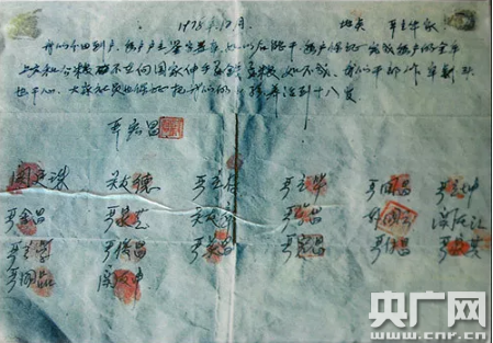 1978年,嚴金昌所在的小崗生產(chǎn)隊人均收入只有22塊錢,每天的口糧只有2兩8錢。窮則思變,就是在那一年的冬天,臨近春節(jié)的一個寒夜,小崗生產(chǎn)隊的18戶戶主在村西頭的嚴立華茅草屋里就著微弱的煤油燈,在包干到戶的契約書上摁下了紅手印。嚴金昌說:“有人說這么干肯定犯法,有的說犯法我們豁出去了,我們收一年莊稼,收半季莊稼,夠吃飽肚子,拉出去殺頭、坐牢也心甘情愿,無怨無悔,總比餓死強,特別是出去要飯,丟人!