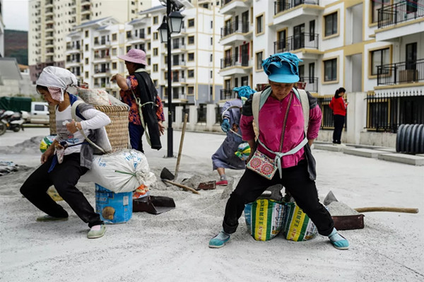 在隆林,高山漢族婦女是出了名的能吃苦,她們正在建筑工地背砂石。