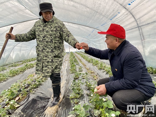 楊長(zhǎng)太在草莓大棚和貧困戶在一起(中央廣播電視總臺(tái)央廣記者 胡曉輝 攝)