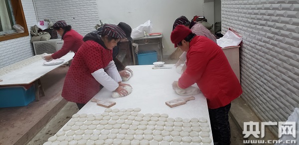 貧困戶們?cè)跅铋L(zhǎng)太家做印子饃(中央廣播電視總臺(tái)央廣記者 胡曉輝 攝)