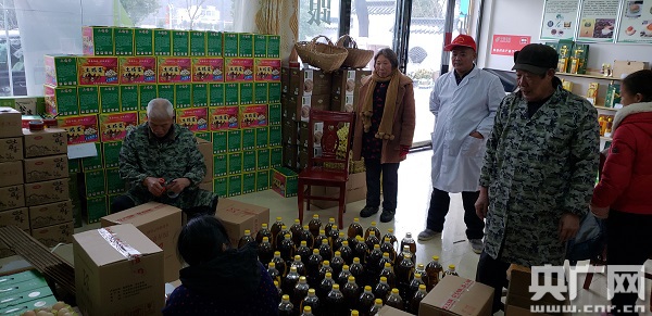 楊長(zhǎng)太和貧困戶一起把農(nóng)副產(chǎn)品打包發(fā)貨(中央廣播電視總臺(tái)央廣記者 胡曉輝 攝)