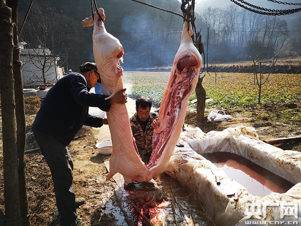 燙豬、刮毛……各項工序按慣例依次完成。收拾了這頭年豬,楊軍軍一家能過個“肥年”,去年,他養豬收入近十萬元。殺豬的動靜引來了不少鄉鄰,他們紛紛圍著楊軍軍“拉呱”起來。