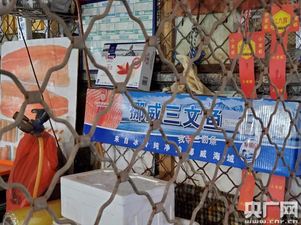 北京大洋路海鮮市場內,三文魚攤位接到通知關閉(中央廣播電視總臺央廣記者 任夢巖 攝)