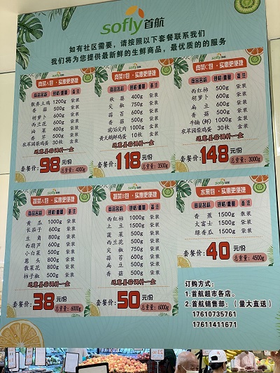 除了門店經營之外,首航超市還面向封控小區、單位食堂等特殊場所推出了“蔬菜包、肉菜包、水果包”。李榮華說,僅七里莊門店每天就提供1000包肉、菜、水果,“因為隨著疫情的發展,有一部分中高風險地區小區的居民購物可能不是特別方便,另外一些單位的食堂也有需求。我們的價格也比較低,目前我們這里對六七個小區、10多家單位食堂大概每天提供將近1000包‘蔬菜包’。”