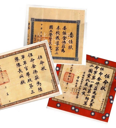 這三份文件分別是兩張任命狀和一張委任狀,每張都如同4開報紙版面大小,現在收藏在金佛莊的家鄉——浙江東陽檔案館。任命狀和委任狀上的黑色毛筆繁體大字,記錄著1924年6月到1925年10月間,金佛莊在黃埔軍校曾接連擔任第三學生隊隊長、教導第二團三營營長和國民革命軍第一軍第一師第二團黨代表。歲月流轉間,三份文件的紙面早已泛著微黃,但字跡、落款、印章,還有文件邊框上棕黃、深藍、亮紅的彩色圖案依然清晰而鮮艷,仿佛在無聲訴說著第一次國共合作期間,以金佛莊為代表的共產黨員們在黃埔軍校揮灑過的熱血與青春。
