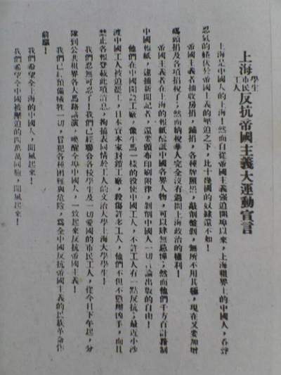 《上海學生市民工人反抗帝國主義大運動宣言》傳單這樣寫道:“上海是中國人的上海!然而自從帝國主義強迫開埠以來,上海租界上的中國人,蜷伏于帝國主義的壓迫之下,比十幾國的奴隸還不如!……我們已經預備犧牲一切,冒犯各種困難與危險,為全中國反抗帝國主義的民族革命作前驅!”