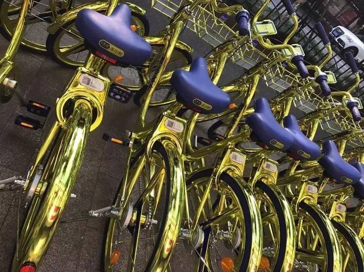 按進入時間早晚排列,杭州的共享單車已有:騎唄(小灰車)、ofo(小黃車)、哈羅單車(小白車)、小鳴單車(小藍車)、永安行(黃藍兩色)、優(yōu)拜單車(小綠車)、摩拜單車(小橙車)、unibike(湖藍色),現(xiàn)在又出了土豪金的共享單車。